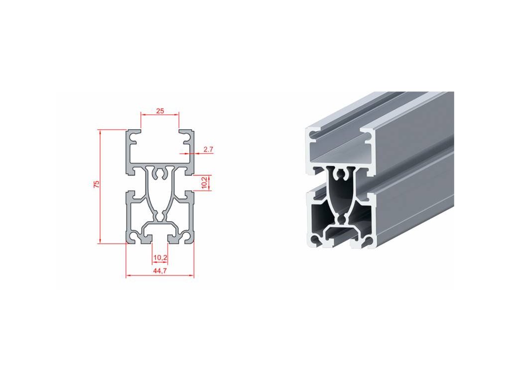 | 1.2.00.045075.00 | 45x75 Conveyor Profile | 45x75 | 6063 T5 | 3000 | 23.46 cm⁴ | 45.80 cm⁴ | 10.50 cm³ | 11.17 cm³ | 9.42 cm² | 2.52 Kg/m | 1000 |