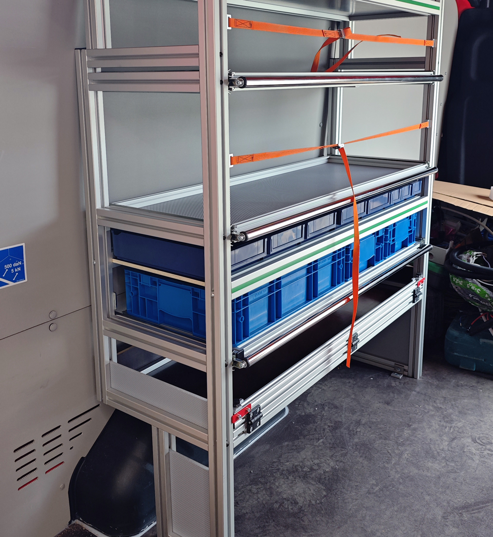 Vybrané realizace hliníkových pracovních vestaveb do dodávek. Každé realizaci předchází, vytvoření 3D modelu, který si klient dodatečně komentuje a který poté finalizujeme. Po montáži se provede zápis do technického průkazu, číslo homologace HP-0579.