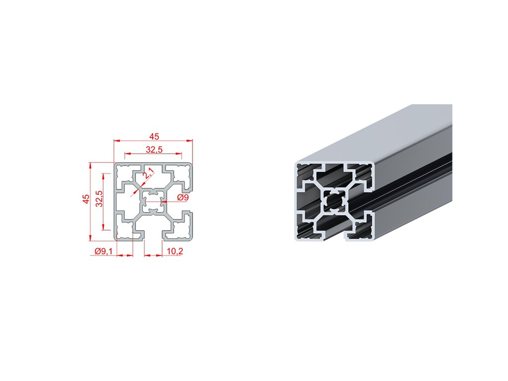 | 1.1.10.045045.05 | Hliníkový stavebnicový profil 45 x 45 mm uzavřený S10 | 45x45 | 6063 T5 | 3000 | 11.83 cm4 | 11.83 cm4 | 5.13 cm3 | 5.13 cm3 | 5.93 cm2 | 1.58 Kg/m | 1000 |