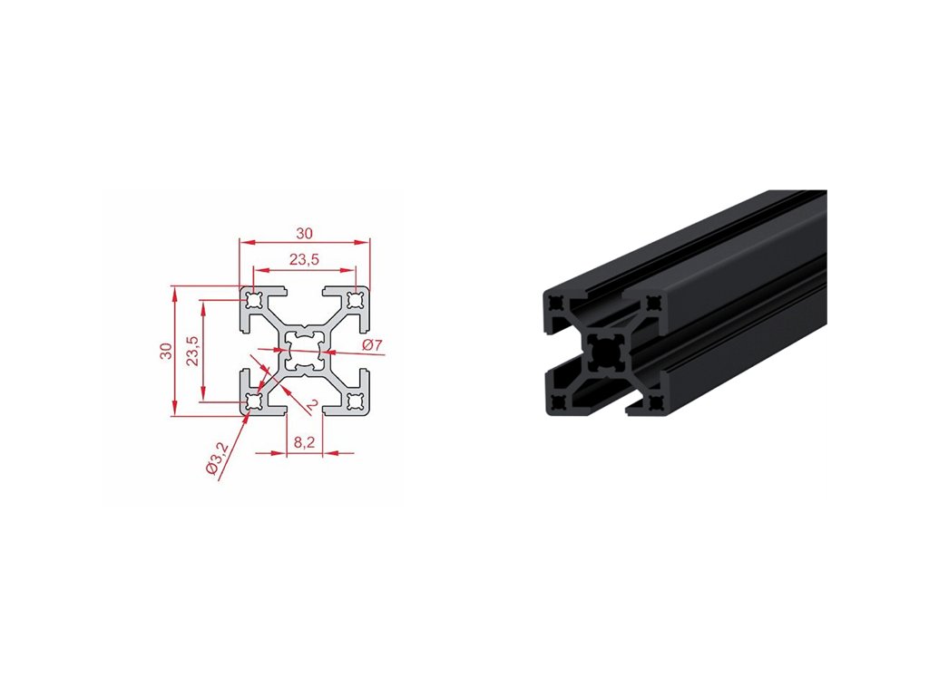 | 1.1.08.030030.02.01 | Hliníkový stavebnicový profil 30 x 30 x 3000 mm černý elox | 30x30 | 6063 T5 | 3000 | 2.96 cm4 | 2.96 cm4 | 1.97 cm³ | 1.97 cm³ | 3.16 cm² | 0.87 Kg/m | 1000 |