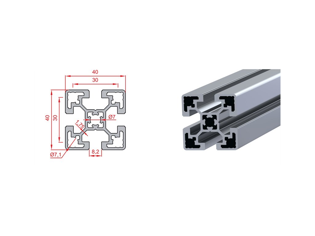 | 1.1.08.040040.02 | Hliníkový stavebnicový profil 40 x 40 mm Light S8 | 40x40 | 6063 T5 | 3000 | 8.49 cm4 | 8.49cm³ | 4.25 cm³ | 4.25 cm² | 5.40 cm² | 1.44 Kg/m | 1000 |