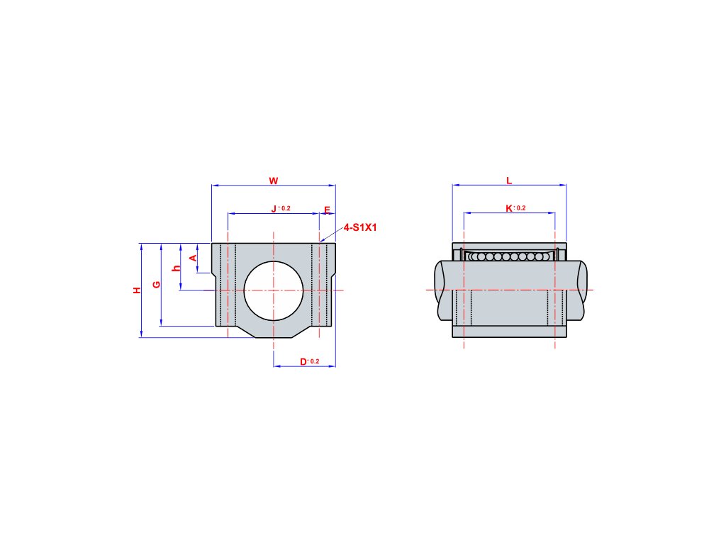 Code | Name | Type | h | D | W | H | G | A | J | E | S1X1 | S2 | K | L | Dynamic Kg | Static Kg | Weight (gr) |