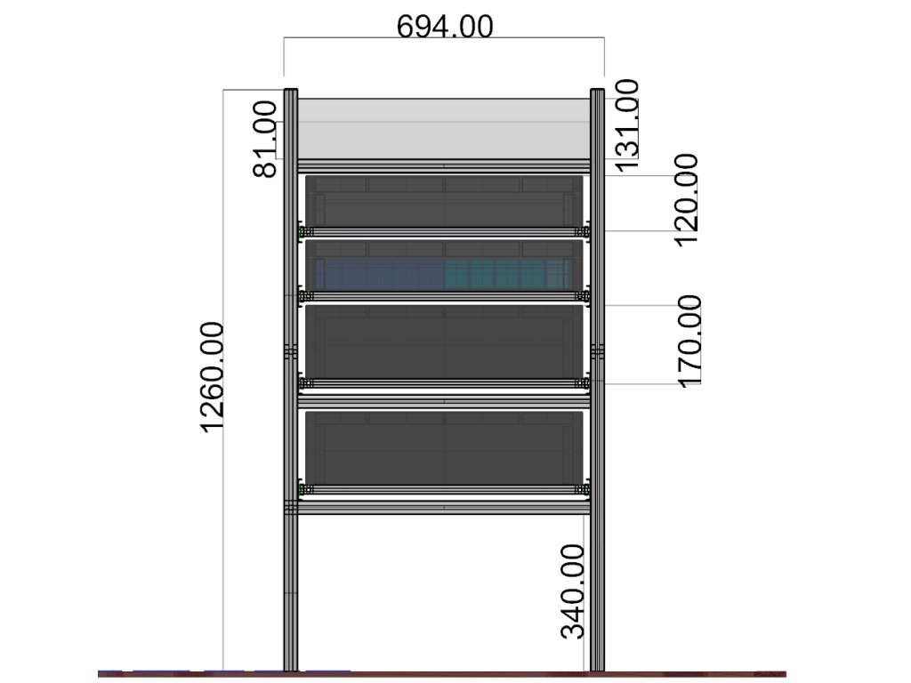 Hlavní konstrukce je tvořena hliníkovými eloxovanými profily 30x60 a 30x30mm