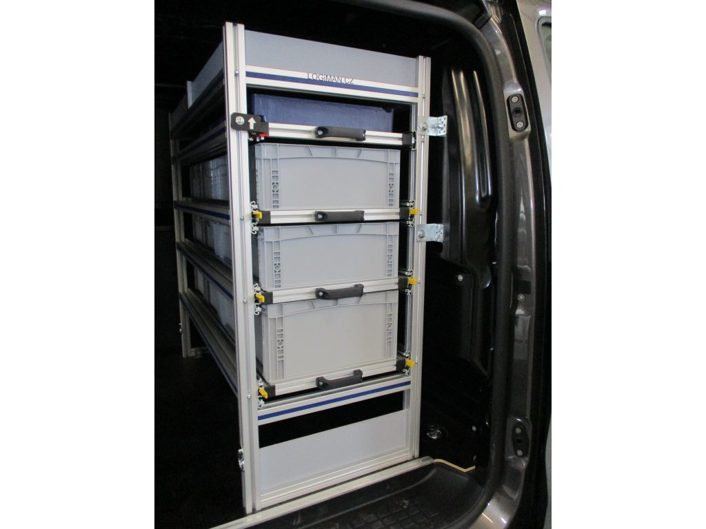Perfektní pro Vaše pohodlí u auta.Hliníková stavebnice, cena v demontu.Určeno pro dodávky VW Transporter, Citroen Jumpy, Ford Custom, Toyota ProAce, Mercedes Vito, Fiat Scudo, Opel VivaroVnější rozměry regálu: cca 1265 x 537 x 1180v mmNosnost každého výsuvu 60 kg.Výsuv 100% tj. 1200mm, integrované pojistky proti vysunutí.Plastové boxy 600x400mm nebo 400 x 300 mm výšky 220 a 170mm je potřeba si zvolit kombinaci přepravek, pouze 600x400 nebo mix.Výsuv na podlouhlé multiboxy pro drobný materiálDno horní police: foliovaná překližka 10mm.Skladbu velikosti boxů lze změnit.