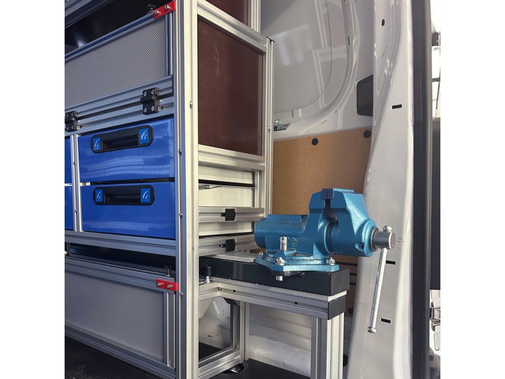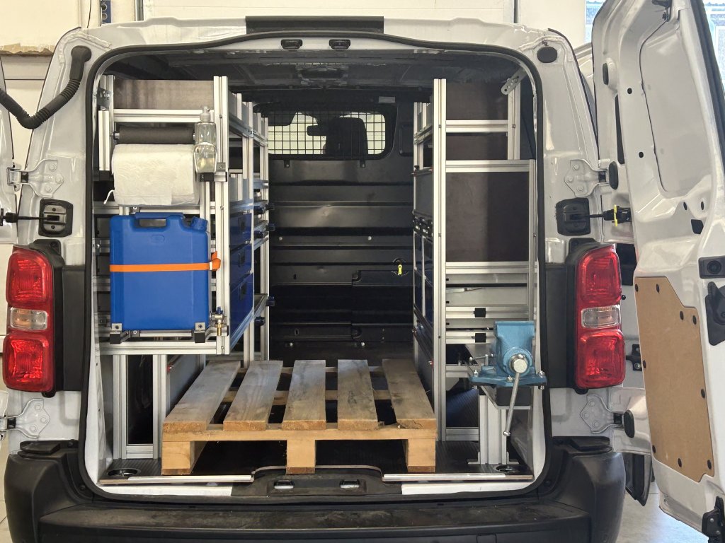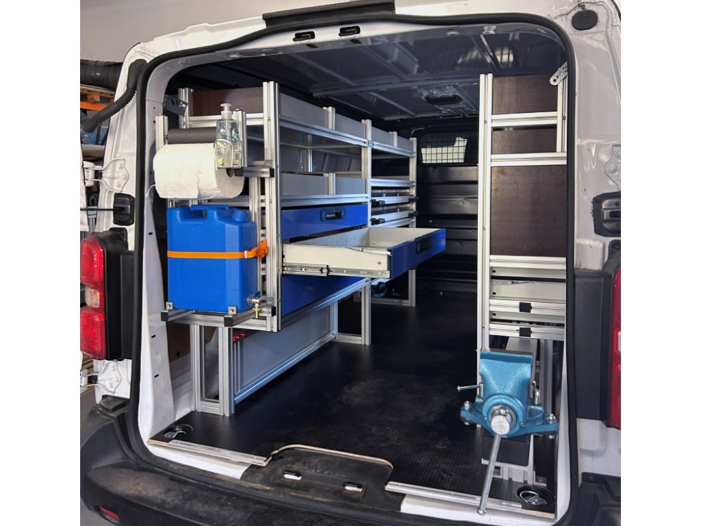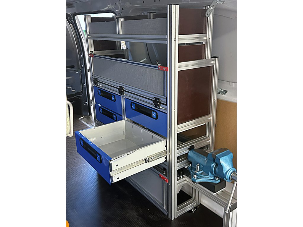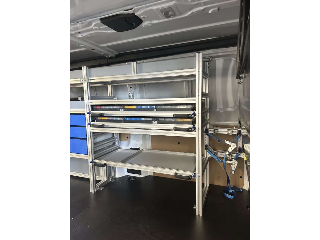 Požadavek byl vozit sebou paletu přestože jsou regály po obou stěnách.Hlavní konstrukční profil: 40x40 SL drážka 10mmCena obsahuje komplet vše dle fotografií a sestavení regálů.Cena obsahuje podlahu 12mm a kotvení do auta ve Slavičíně (ZL).
